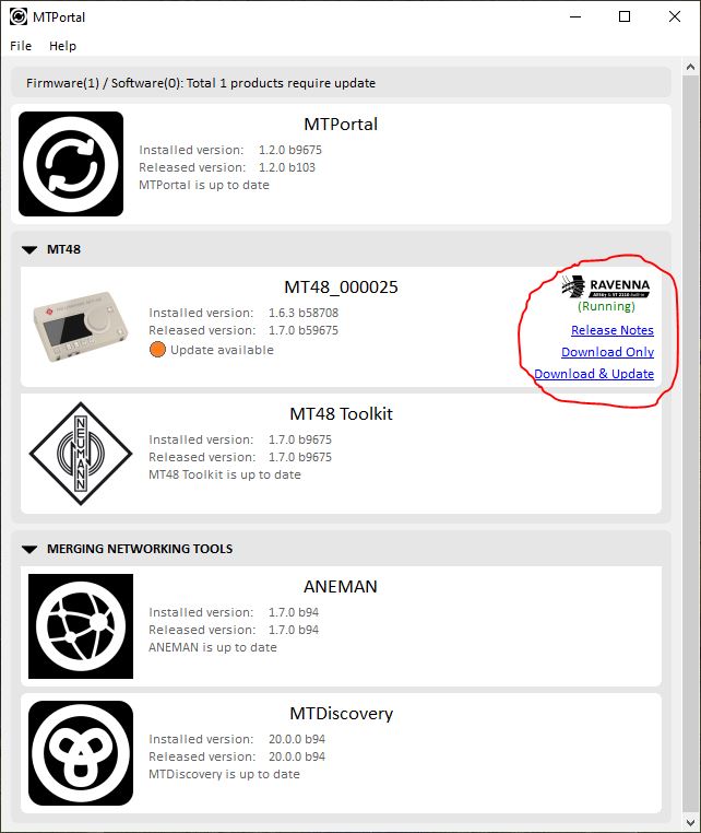 Great! In my case, there were no updates for the MT48, but there was an update ready for MTDiscovery. All updates will present themselves in a similar manner across sections, so be sure to keep an eye out for that “Download & Update” button.